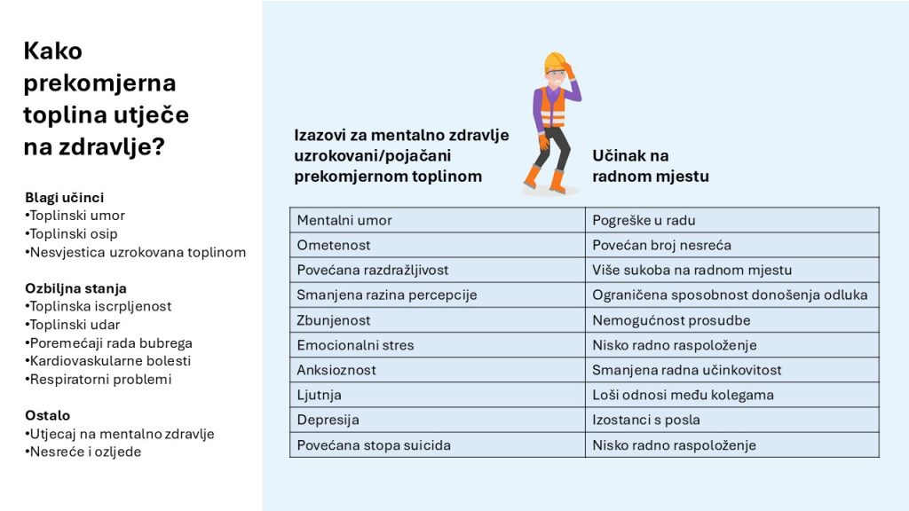 Prekomjerna vrućina doslovno hakira naše tijelo i um. Kako temperatura raste tako lošije razmišljamo, sporije reagiramo, više griješimo. Svaki dio našeg tijela osjeća posljedice. Time se povećava broj pogrešaka i raste broj ozljeda na radu. Međunarodna organizacija rada (ILO) procjenjuje da toplinski stres na poslu uzrokuje oko 23 milijuna ozljeda i gotovo 19 tisuća smrtnih slučajeva godišnje. U Europi i srednjoj Aziji rizik za radnike od ekstremne vrućine raste brže nego bilo gdje drugdje u svijetu – porastao je za više od 17 % od 2020. godine. Američki Nacionalni institut za sigurnost i zdravlje (NIOSH) navodi da su radnici stariji od 65 godina, osobe s prekomjernom tjelesnom težinom, srčanim bolestima ili visokim krvnim tlakom izloženi većem riziku od posljedica ekstremne vrućine. Kad tome pridodamo činjenicu da je Hrvatska među šest zemalja Europske unije s najstarijim stanovništvom i da se procjenjuje kako će do 2050. svaki treći stanovnik imati više od 65 godina, jasno je da situacija postaje složenija.